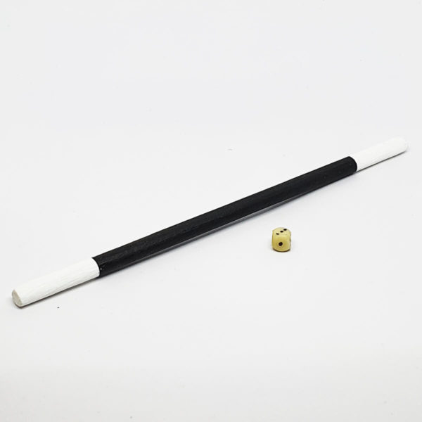 Un dado disminuye sus dimensiones sorprendentemente, al cerrar la mano y dar un pase con una pequeña varita mágica ante los ojos de los espectadores aparece muy pequeñito.