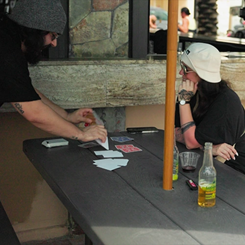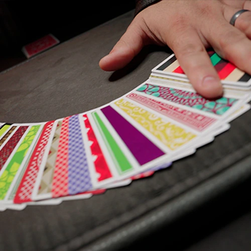 Comienzas mostrando una baraja donde cada carta tiene un diseño diferente en el dorso. No hay dos iguales.